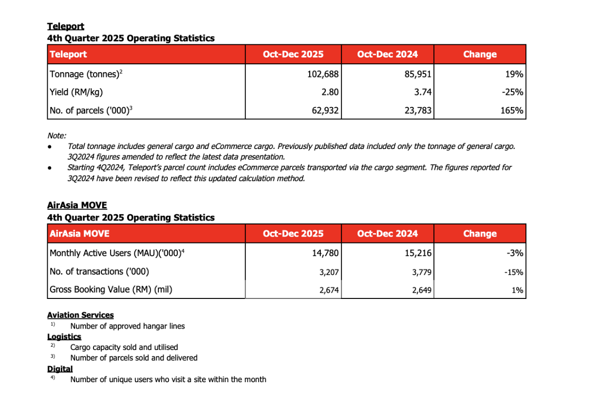 Following the disposal of the aviation business to AirAsia X Berhad, the Group now comprises five core businesses—ADE, Teleport, AirAsia MOVE, Santan and AirAsia Next. Accordingly, this quarter’s results reflect aviation performance only up to 3 December 2025—the divestment completion date—covering approximately two months for 4Q2025 and 11 months for FY2025.