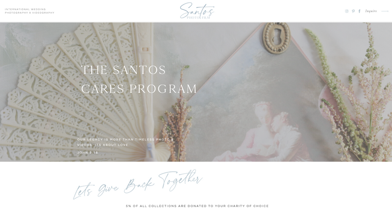 The Santos Cares Program is structured to operate as a standing component of all primary wedding day collections, rather than as an optional add-on or seasonal campaign. For each contracted wedding collection, Santos Photo & Film allocates a defined portion of proceeds to charity, with an emphasis on organizations serving local communities and causes aligned with the couple’s values. During the consultation, the team presents a curated list of charitable options, then follows up with an onboarding email so couples can easily review these choices and confirm the organization they would like their wedding collection to support.