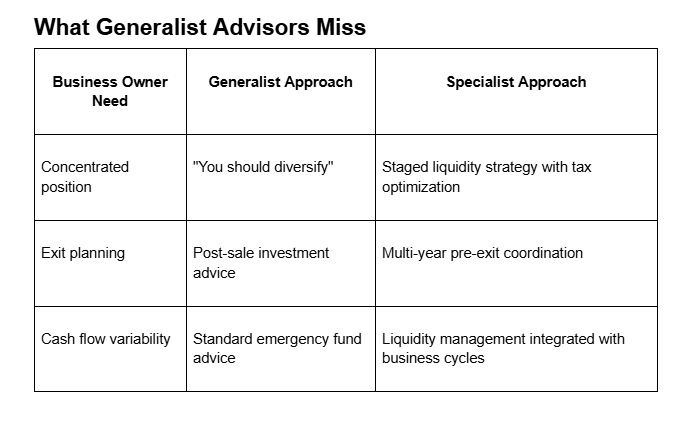The difference isn’t capability—it’s pattern recognition. Advisors who serve business owners regularly have seen these situations repeatedly and understand the decision frameworks that produce optimal outcomes.