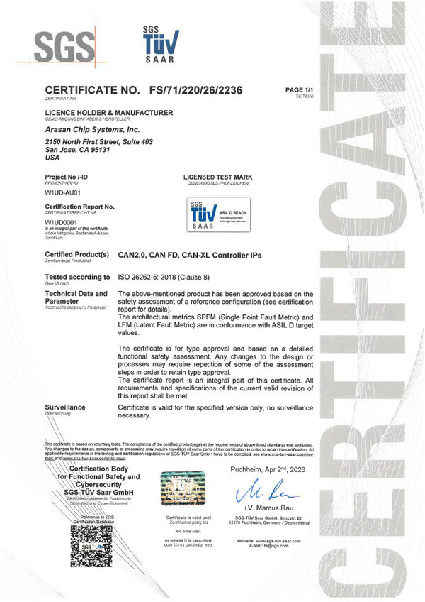 SAN JOSE, Calif., Apr. 21, 2026 /PRNewswire/ — Arasan Chip Systems, the industry’s leading provider of IP for Mobile and Automobile SoC’s, announced today that its CAN XL IP has achieved the ASIL-D Certification. The CAN XL IP has been independently certified by SGS-TÜV Saar as ASIL-D, the highest safety level of functional safety defined in ISO 26262, the international standard for functional safety in road vehicles.