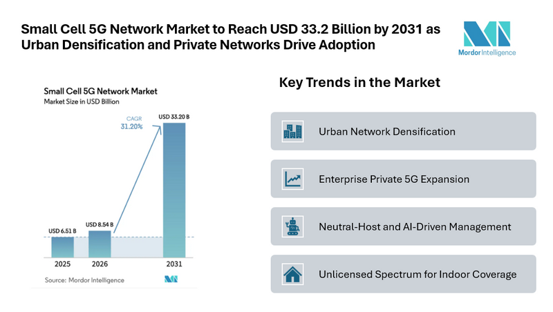 According to Mordor Intelligence, the small cell 5G network market size is expected to grow from USD 6.51 billion in 2025 to USD 8.54 billion in 2026 and is forecast to reach USD 33.2 billion by 2031, registering a CAGR of 31.2% during the forecast period. Rising data consumption, demand for low-latency connectivity, and the need to extend coverage in dense urban zones are central to this outlook. These factors are shaping the market size and creating new deployment opportunities across indoor venues, transportation hubs, campuses, and smart-city corridors.